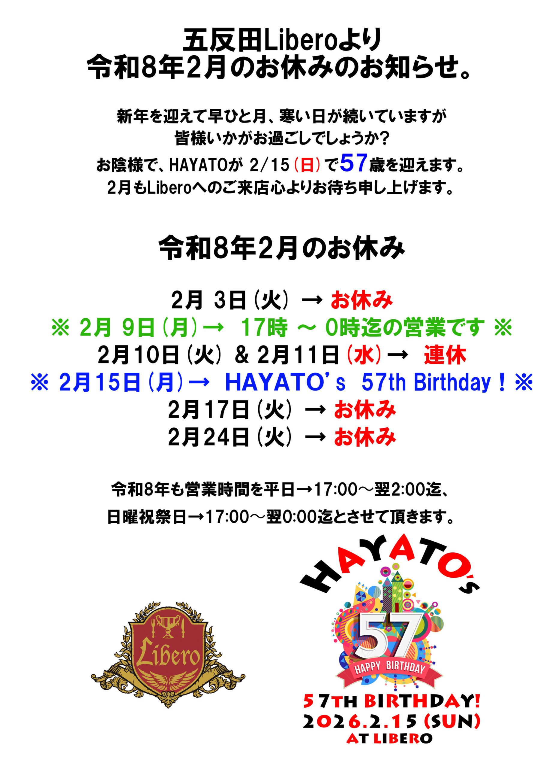2月もLiberoへのご来店心よりお待ち申し上げます。